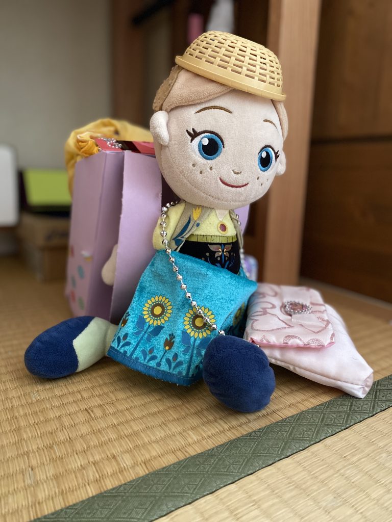 そうはいっても、まだまだ幼く、次女が学校に行くと、彼女の机の下には写真の通り、アナがいます。